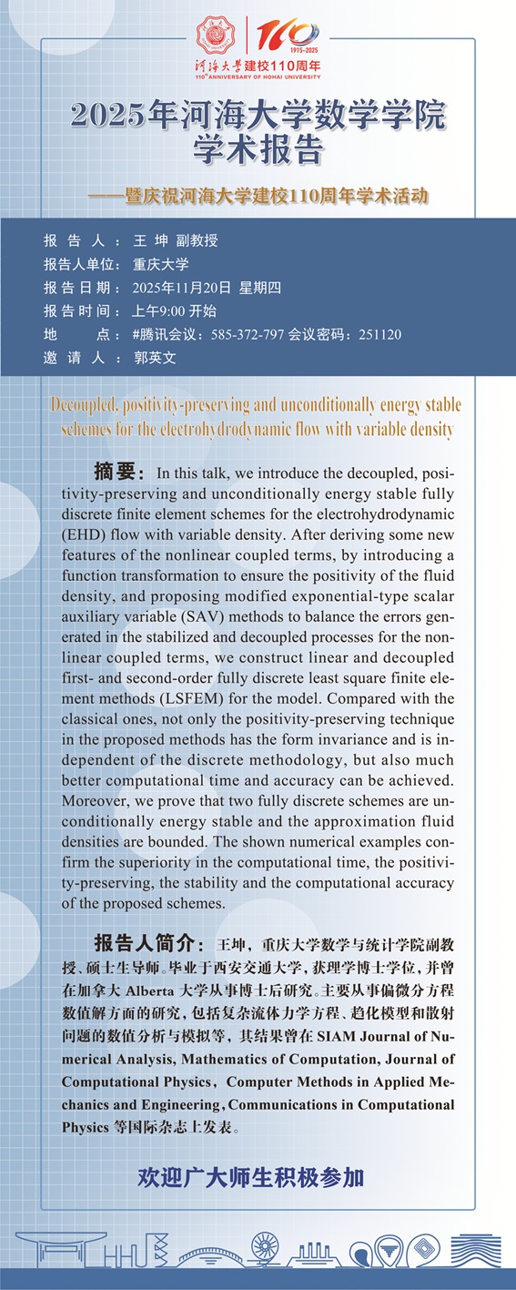 成人影院 第29次学术报告:Decoupled, positivity-preserving and unconditionally energy stable schemes for the electrohydrodynamic flow with variable density